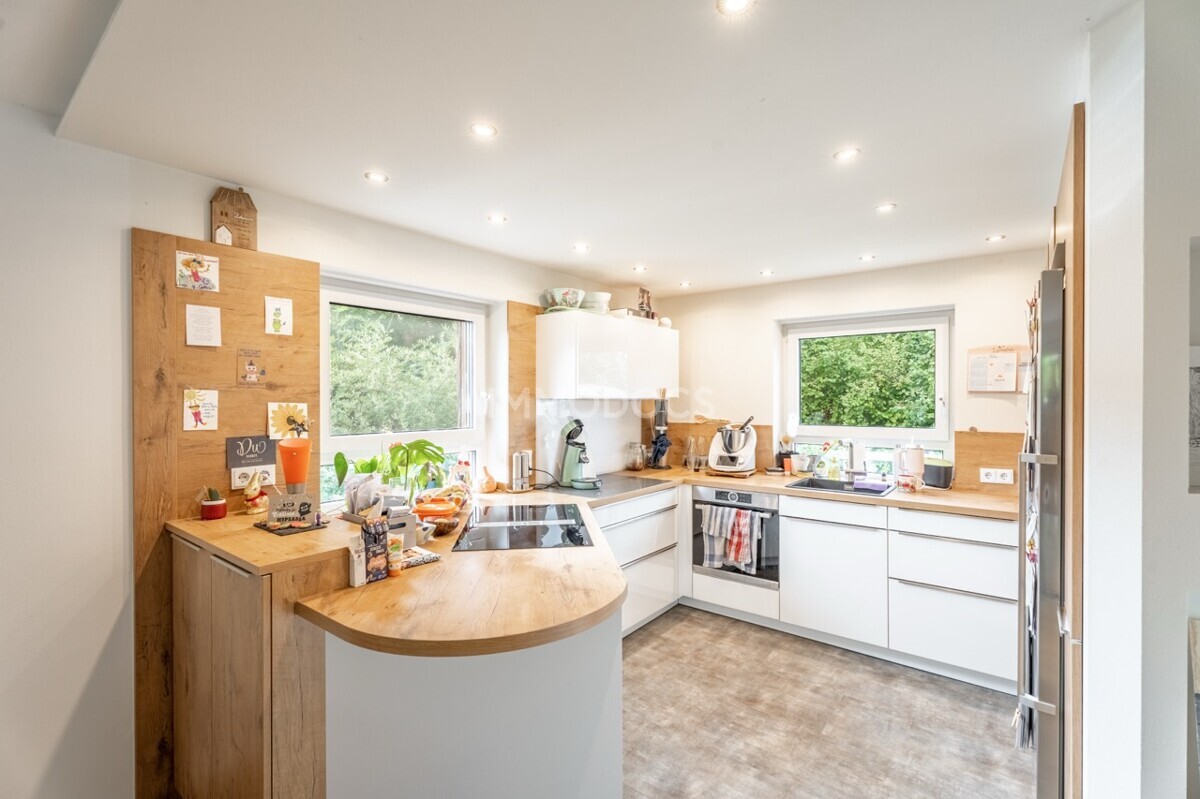 Der Keller bietet vielseitige Nutzungsmöglichkeiten mit Hobbyraum, Waschraum, Lagerraum und zusätzlichem Stauraum. Im Außenbereich stehen zwei Terrassen, ein gepflegter Gartenbereich sowie eine Garage und mehrere Stellplätze zur Verfügung.
