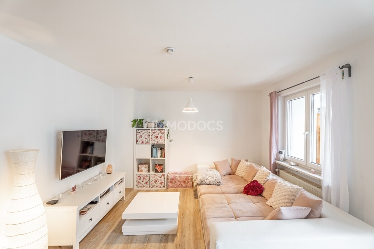 Diese großzügige Doppelhaushälfte in Waltenhofen-Rauns überzeugt durch modernes Wohnen, hochwertige Ausstattung und eine ruhige Lage in einer Privatstraße ohne Durchgangsverkehr. Im Erdgeschoss empfängt Sie eine helle Diele mit Gäste-WC, die in den offenen Wohn- und Essbereich mit moderner Küche übergeht. Der Kamin im Wohnzimmer sorgt an kühleren Tagen für eine besonders gemütliche Atmosphäre, und vom Wohnbereich aus gelangen Sie direkt auf die vordere Terrasse.