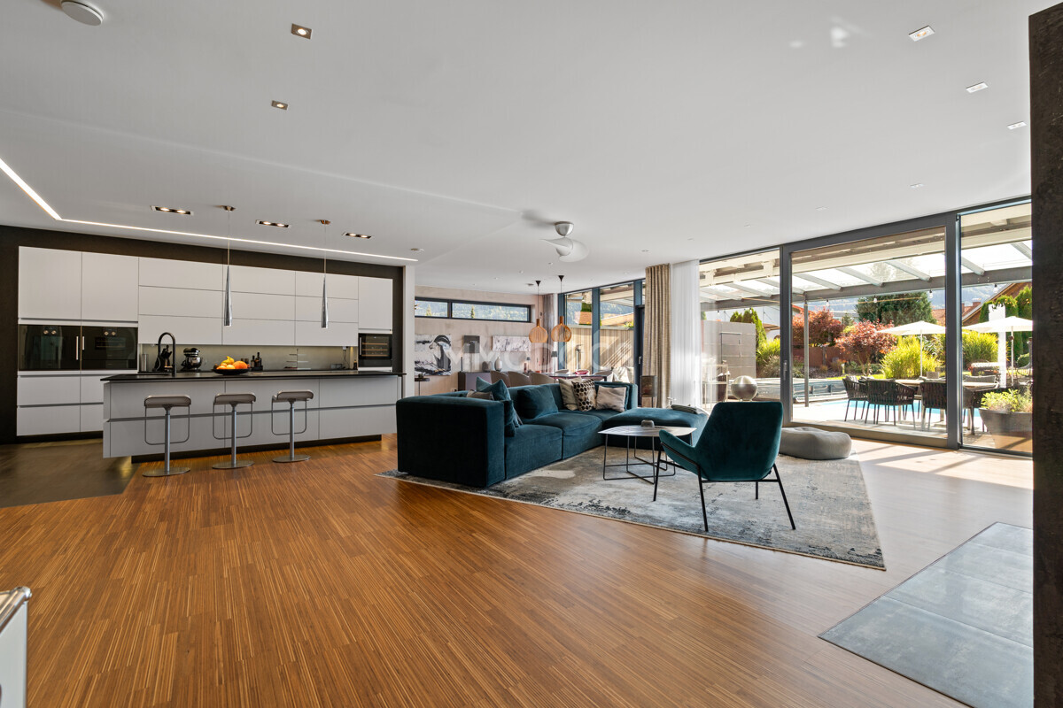 Der Außenbereich vermittelt mit mehreren Terrassenbereichen, dem großzügigen Pool und dem Whirlpool echtes Urlaubsflair. Eine große Doppelgarage, hilfreiche Nebenräume und moderne Haustechnik inklusive Photovoltaikanlage sorgen für zusätzlichen Komfort..